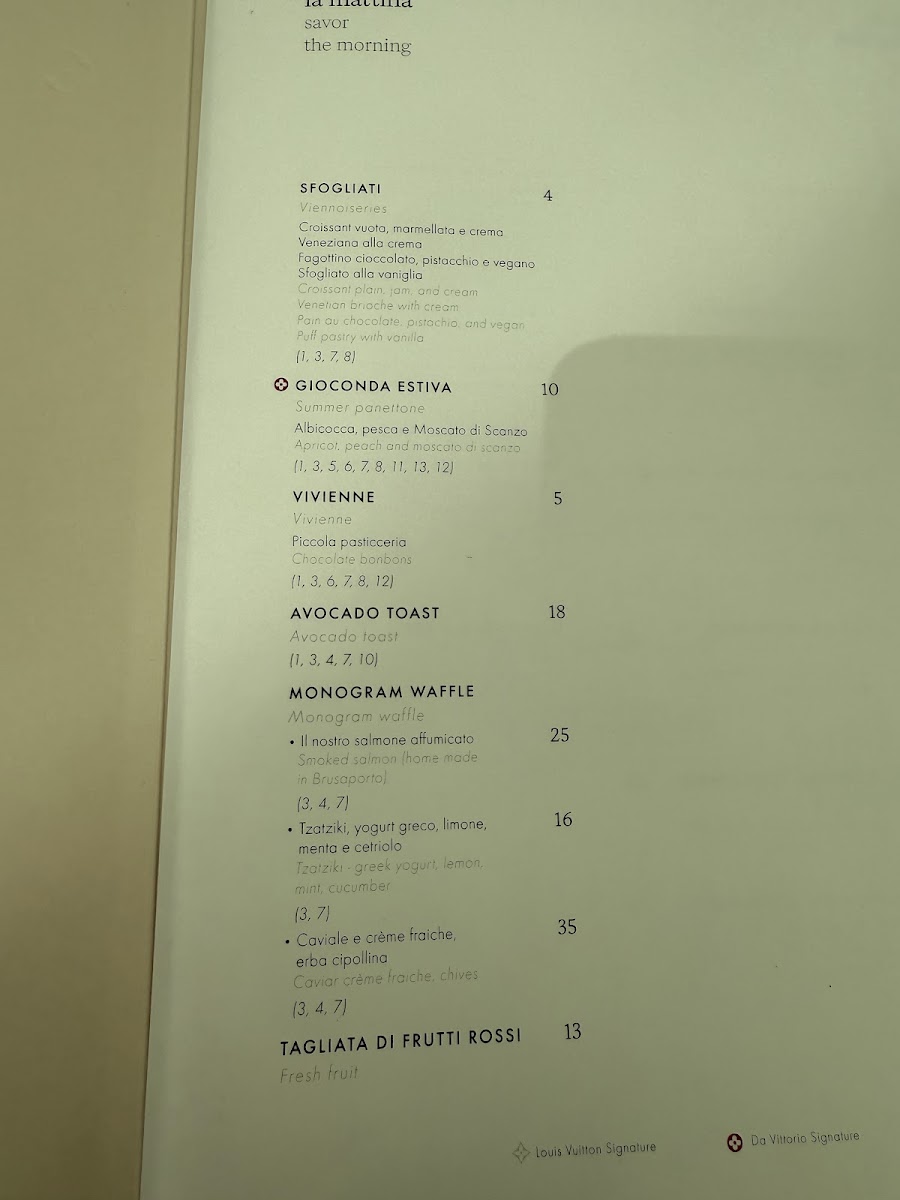 At Da Vittorio Café Louis Vuitton, situated on the renowned Via Monte Napoleone in Milan, the menu offers a delightful escape for both coffee and dessert aficionados. Renowned for its impeccable quality and presentation, the café provides an inviting ambiance, making it the perfect spot for a mid-morning break.